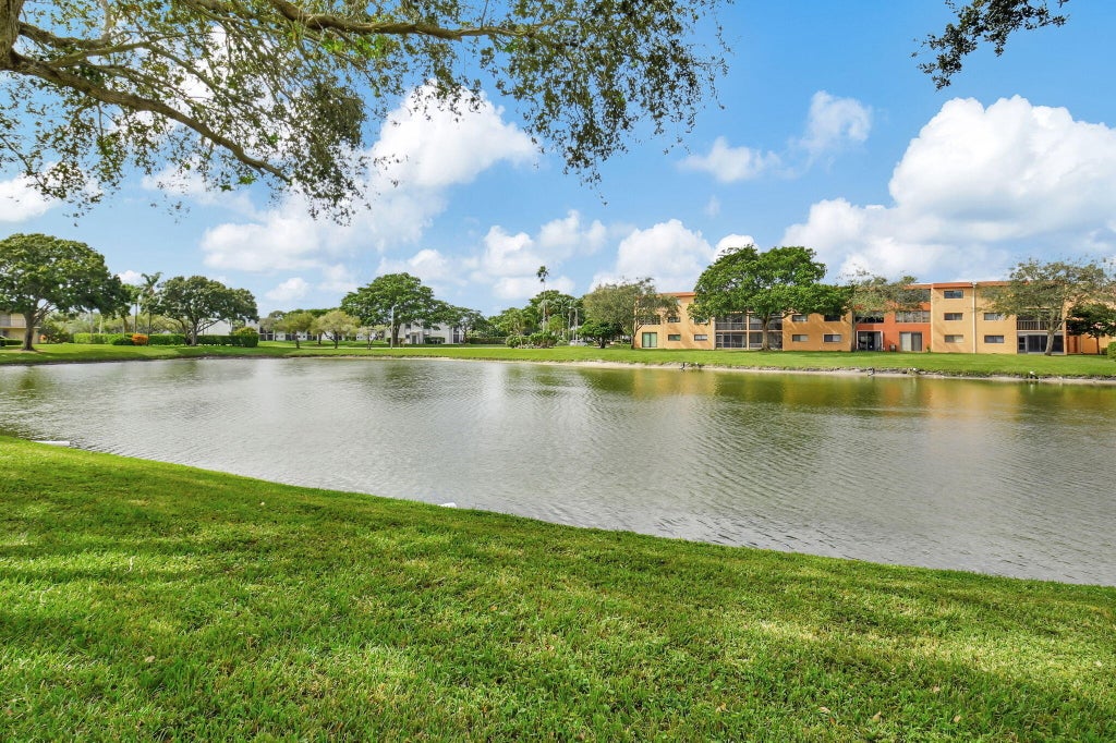 The greatest Watersedge Lakefront deal in all of Lakes of Delray! Largest 2/2 ground floor condo at over 1,300 sq. ft. under a/c, with large neutral colored tiling throughout. As soon as you enter the front foyer and see the kitchen, updated with Stainless steel appliances, granite countertops, woodgrain cabinetry and an undercounter corner lazy susan. Eat-in-kitchen accomodates table for 4 along with huge pantry.Both bathrooms updated. Additional utility room with full sized side by side washer/dryer. So much storage space as well. Living room extends to an ''inverted Florida Room'' (like additional den area) just before reaching the outside sliding glass doors. Your peaceful/serene views on wide lake are to behold. Hurricane accordian shutters for protection. Clubhouse with amenities