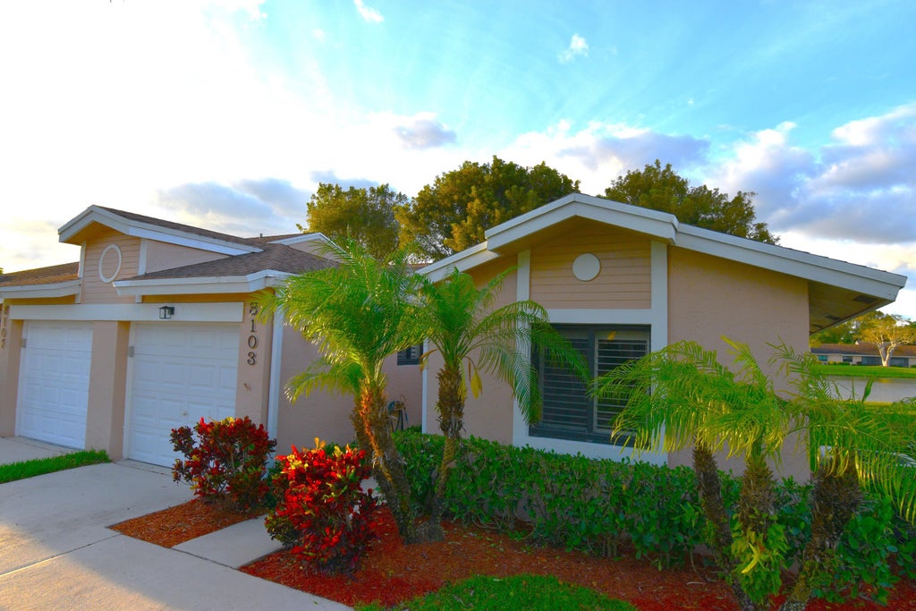 Turnkey furnished option. Designer style upgraded Chateau villa end unit with water view. New fully paid roof and gutters (11/2024). New 3-ton 15.2 SEER2 HVAC system (8/2024). New hot water heater (2023). The villa is secured with complete high impact doors and windows, including the floor-to-ceiling Florida room sliders and garage door. The original exterior sunroom was legally enclosed creating an interior air-conditioned Florida room with a PBC building permit. The villa is now 1409sf under air, the largest in Eastgate! With the revision, the villa is now stepless from the driveway, throughout the interior to the backyard brick pavers patio overlooking the water. The end-unit wall faces east, avoiding the hot afternoon sun, with 4 windows, one for each bedroom and bath.