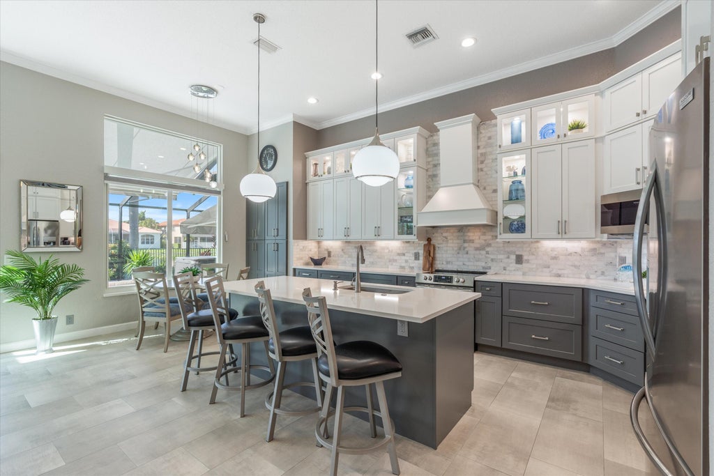 Welcome home!! New tile roof, impact windows & doors- installed 2021. Heated saltwater pool w/new enclosure. This meticulously renovated, single-level 4-bedroom home offers the perfect blend of modern luxury and serene lakeside living. With 12 ft. ceilings, expansive windows frame panoramic lakefront views, and allow the natural light to pour in. The spacious open-concept floor plan seamlessly connects the gourmet kitchen, dining, and living areas while providing ultimate comfort and style. Ideal for both relaxation and entertaining, this home boasts high-end finishes, thoughtful design, and ample living space all on one convenient level. The split floor plan separates guests/ children from the Primary suite. The custom designed Billiards room with floor to ceiling windows is a bonus!