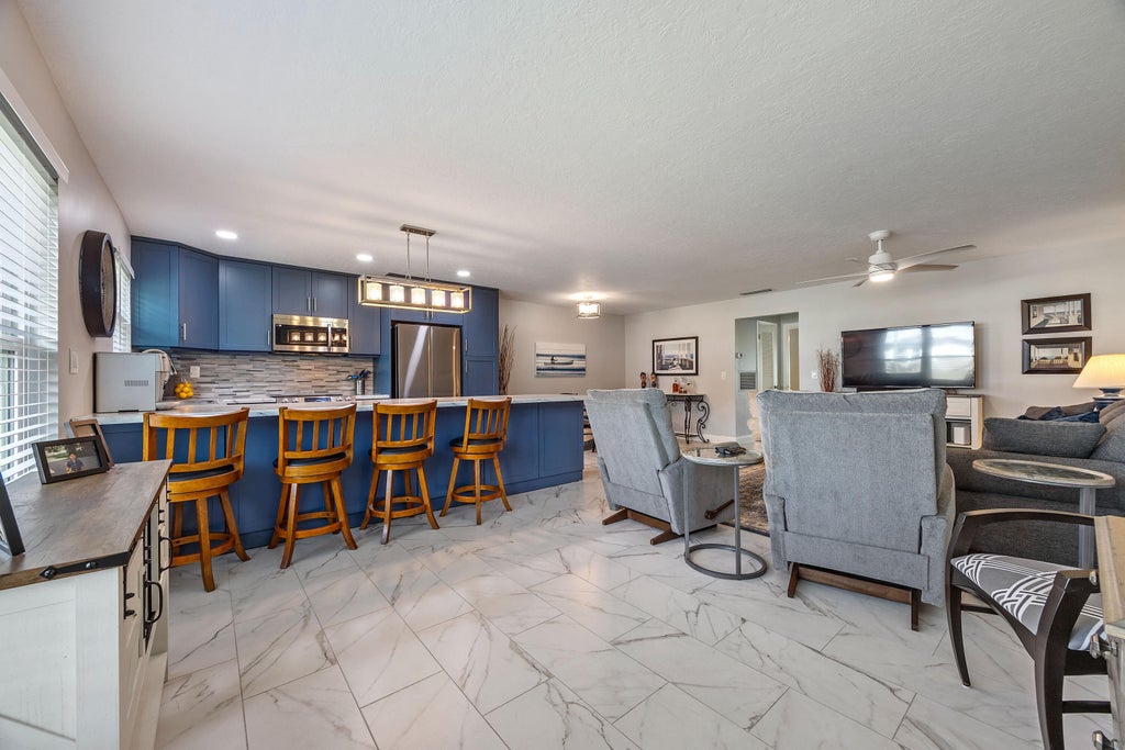 Stunning fully furnished/turnkey villa-style condo in the highly sought High Point Sec 4. Property features ceramic tile flooring throughout. Open concept living w/ remodeled kitchen equipped w/ suite of Samsung Appliance & ample storage w/ pantry w/ pull-outs, easy access. Huge Living room with knockdown finished ceilings, NO POPCORN & new La-Z-Boy pull-out sofa. New light fixtures & ceiling fans throughout. Large primary w/ 2 walk-in closets, plus remolded ensuite offering a step in shower & new vanity w/ storage & LED mirror. Florida room offers additional space w/ murphy bed perfect for guest. Updated 1/2 bth. Huge paver patio with lush landscaping for privacy. HVAC 2023, ROOF 2023, HWH 2023. The community offers a low monthly fee PLUS 2 pools, clubhouse, putting green & tiki bar