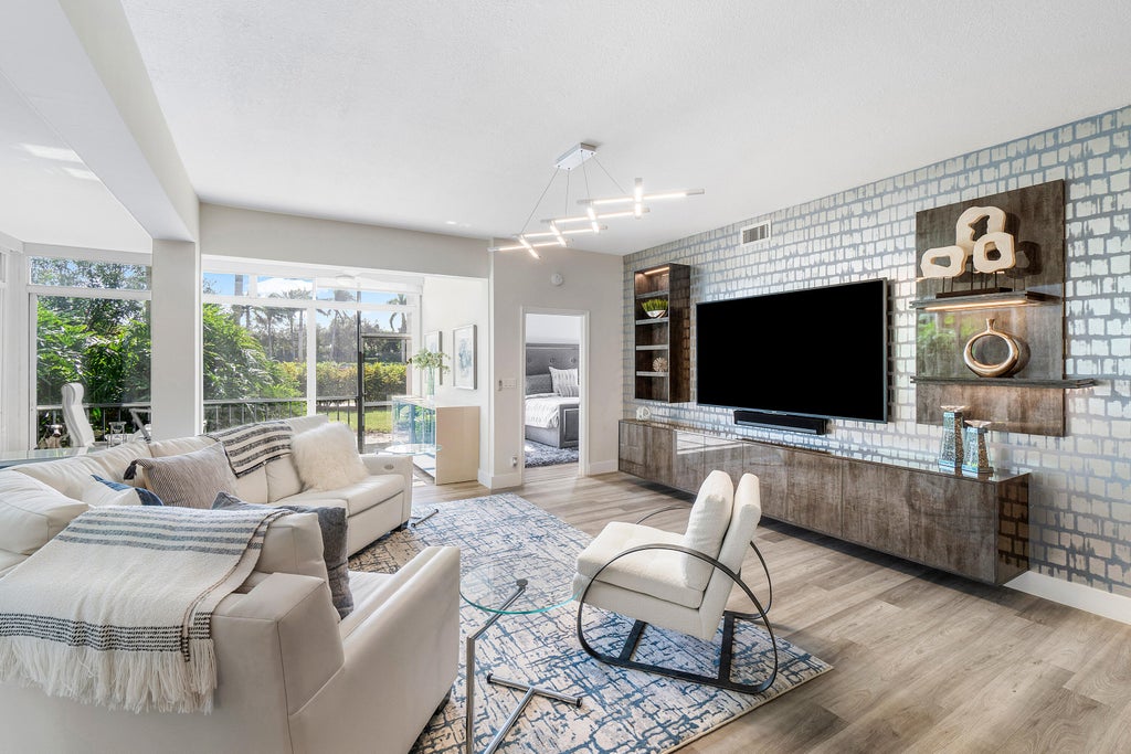 Upon entering this fully renovated condo, you're welcomed by a seamless blend of modern elegance and comfort. Bathed in natural sunlight, the space feels airy and open, enhanced by the open-concept layout. Thoughtful design details throughout like curated wallpaper add a touch of sophistication. The sleek kitchen offers ample storage and modern appliances, while the elegant dining space acts as the perfect setting to entertain. The spacious family room is highlighted by built-in cabinetry with integrated LED lighting. Gorgeous lake views add to the ambiance of the living spaces. Additionally, the fully-enclosed patio is customized with a built-in desk creating a chic office space. The primary bedroom is generously sized, featuring two closets, dual sinks, and a large shower for a spa-like