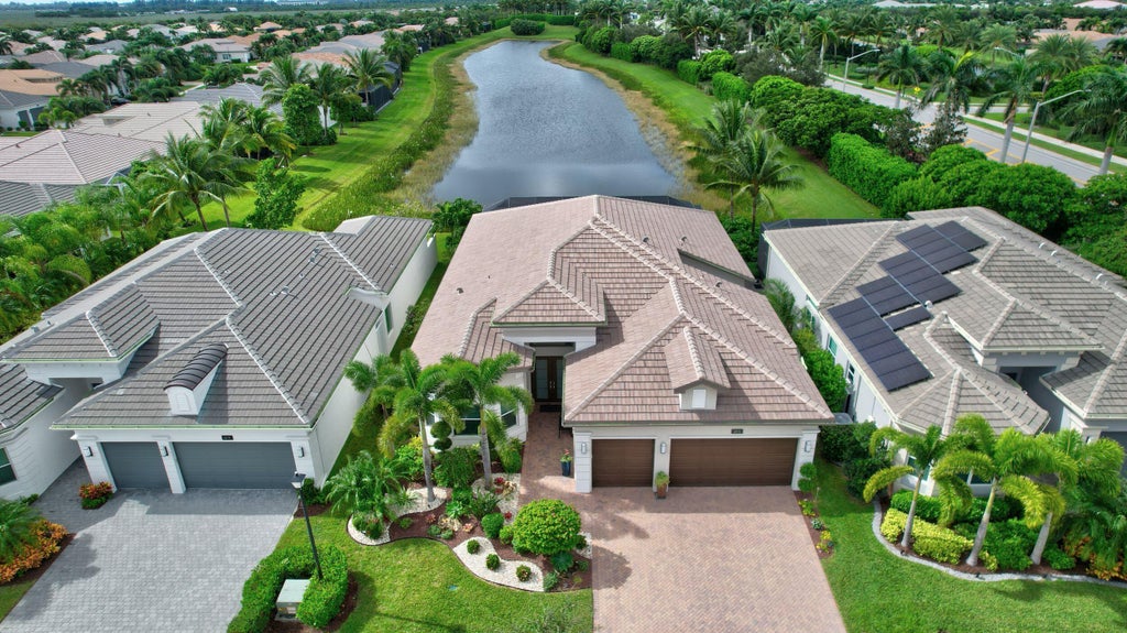 Rare chance to own a magnificent move in ready upgraded home complete with impact glass on one of the best private water lots in the community! True pride of ownership prevails in this professionally decorated Piazza model on fabulous long waterfront lot featuring 3 bedrooms,3 bath plus den/office, two outdoor patio areas + 3 car garage. Extras include state of the art lighting, fitted closets, central vacuum system, custom built ins, custom barn doors & window treatments, extended COVERED patio roof line with extended screen enclosure, your very own upgraded jetted hot tub & motorized storm smart screens to protect your outdoor furnishings from wind rain etc. Enjoy this great home for entertaining in-between walking to 33000 sq ft clubhouse to cafe, gym, tennis, pickleball, clubs, shows