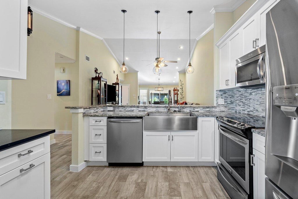 A Stunning Villa That Truly Shines!Step into this meticulously renovated villa, where every detail has been thoughtfully upgraded. This home is the epitome of modern living, blending style, functionality, and comfort.The completely remodeled kitchen features an open concept with the removal of a wall, stainless steel appliances, a sleek apron sink, and a reverse osmosis system. Wood-look ceramic floors flow throughout the entire home, complemented by crown molding in every room, even the bathrooms. The ceilings have been modernized with all popcorn removed and freshly painted, including the garage.This villa boasts new sliding glass doors in both the living room and bedroom, custom drapery, Venetian blinds, and sheers for a polished look. Additional
