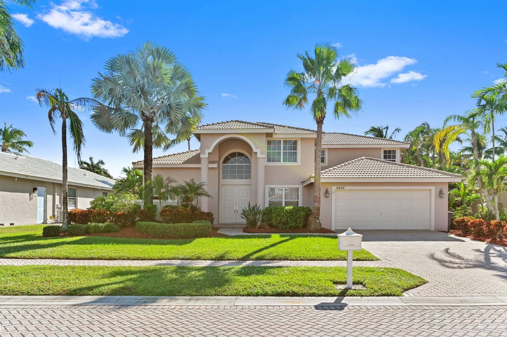 Nestled within the prestigious, gated community of Estates of Boynton Waters, this stunning two-story home offers an exceptional blend of elegance, comfort, and convenience. The paver brick streets and guard service set the tone for the upscale lifestyle this community provides, complemented by resort-style amenities such as a clubhouse, tennis courts, and a sparkling community pool. Inside, you're welcomed by dramatic vaulted ceilings and an abundance of natural light, creating a grand yet inviting atmosphere.