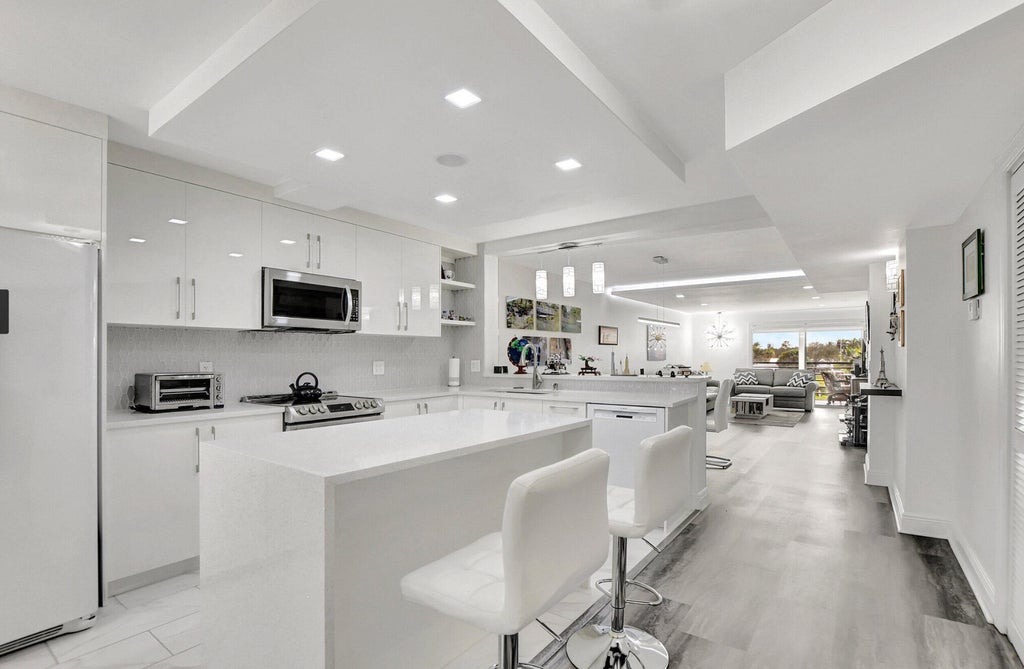 Experience the best of Boca Raton living in this stunning, fully remodeled condo. Just 6.5 miles to Beach and Town Center Mall, this home offers the ultimate blend of luxury and location. Step inside to discover a beautifully redesigned open floor plan with sleek European modern style. The kitchen is a showstopper, featuring quartz countertops, high-ceiling soft-close cabinets, and a dramatic waterfall island--perfect for entertaining. The spacious living area boasts a custom drop-down ceiling, recessed LED lighting, and built-in surround sound for the ultimate relaxation or movie night.This building is NOT 55+ or Older. ALL AGES are welcome!