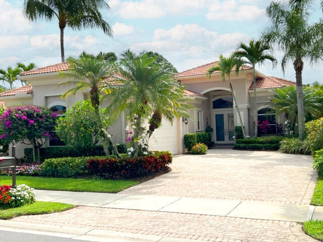 Beautifully designed and landscaped chateau model ideally situated with easy walking access to the clubhouse and all amenities. Impeccably maintained, this three bedroom plus den/office model features custom moldings and casings, specialty kitchen cabinets with glass doors, and lighting with a functional bar/coffee area for easy everyday living. The primary suite has wool Karastan carpet and holds one of the largest custom closets in all of Mirasol. Primary bathroom has ceiling height mirrors marble countertops custom cabinetry and tiled shower with built-in seating. The powder room is finished with an onyx top and Kohler fixtures that appeal to a casual yet elegant taste. 2-car garage plus a golf cart garage, with lots of storage! Sports membership.