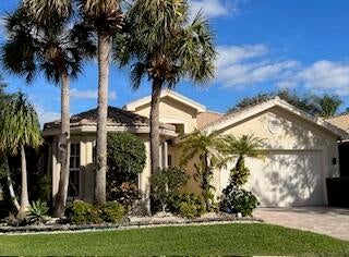 Updated home on quiet street with lovely Lake views from Great Room, Extended Lanai and Primary BR. Tray ceiling entrance and in many rooms. Front bedroom w/bay windows adjoins full bath. Den with built-ins. Extra LED High Hats. Many fans. Dining Area and Living Room with tray ceilings. Updated Chef's Kitchen with newer SS and 2 Wall Ovens along with Bosch Cook Top. Extended Peninsula with bar seating. Primary Bedroom with en-suite Spa Shower, jetted tub, Rounded walls, upgraded lighting and more. All floors upgraded and no carpeting! 2019 AC w/ UV. 2023 Water. Garage EV outlet,, cabinets and more. Upgraded ADT Security, Valencia Pointe is best located with a Resident Only gate to Woolbright Center (Publix, Walgreens, Banks, Deli, Restaurants, Services and more.)