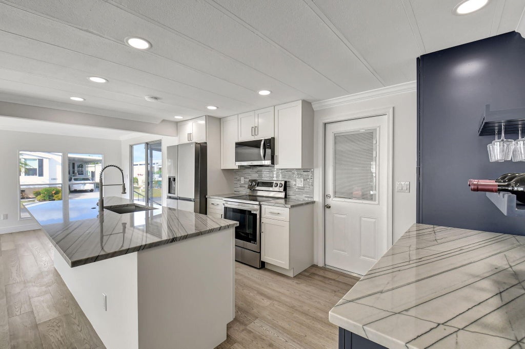 COMPLETELY REMODELED! The PREMIERE property in all of Jamaica Bay, Boynton Beach's prime 55+ manufactured home community! NO LAND LEASE! No stone was left unturned in this COMPLETE REMODEL. The DETAIL and QUALITY is unmatched. Almost 1,400 sq feet with AC added to the Florida room! Top to bottom, this home is virtually BRAND NEW. Where to begin...NEW kitchen, appliances, quartz countertops, flooring, bathrooms, showers, hot water tank, sealed roof, drywall, crown molding, custom floor vents, baseboards, electrical panel, walk-in laundry room w/ pantry, and custom primary closet. New AC installed in the Florida room w/ custom cushions and seating area. Steps away from the clubhouse and pools, this is the best location within the community.