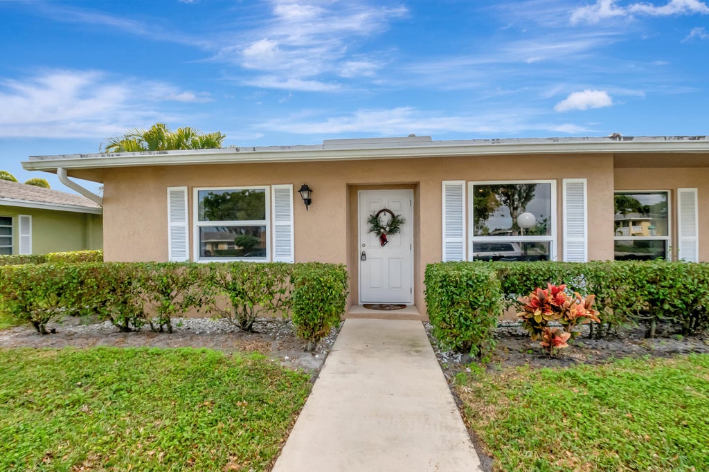 BEST DEAL IN THE PINES: Fully furnished, turnkey, renovated, corner villa in 4-plex. Bright and airy, one-story 2-bedroom, 2-bath with 1,167 sf of living space plus an enclosed sun room and patio area. This thoughtful layout boasts two split bedrooms, each with its own en suite bathroom. Beautiful porcelain tile floors extend throughout. The kitchen which is equipped with newer appliances has ample cabinet and counter space. The unit has all hurricane impact windows/doors and newer A/C unit. Pines of Delray, an active community offers amazing amenities: two heated pools, hot tub, clubhouse, fitness center, pickleball, bocce ball, tennis and shuffleboard courts. It is located just minutes from downtown Delray Beach with easy access to beaches, golf, restaurants and night life.