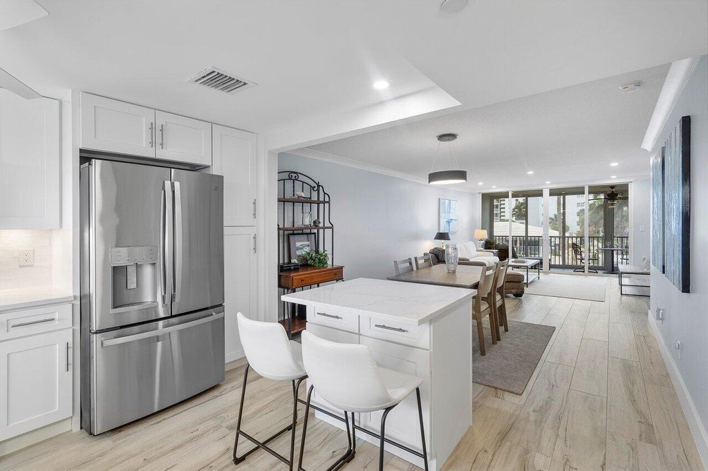 Stunningly renovated 2 bedroom, 2 bath condo with beach access & gorgeous views of the Intracoastal from the Living area, patio, & primary bedroom. This residence has undergone a complete transformation using top-notch materials & meticulous craftsmanship. The interior boasts a charming beach chic style with a palette of whites, sea glass greys, warm sand tones, & elegant wood accents. The furniture is negotiable! This exceptional property radiates luxury & comfort with features like crown molding, updated bathrooms, a brand new open kitchen with island, stainless appliances & stylish cabinetry, upgraded electrical fixtures, impact windows, & brand new flooring AND comes fully furnished. This condo also offers the convenience of the very first parking spot at the building entrance