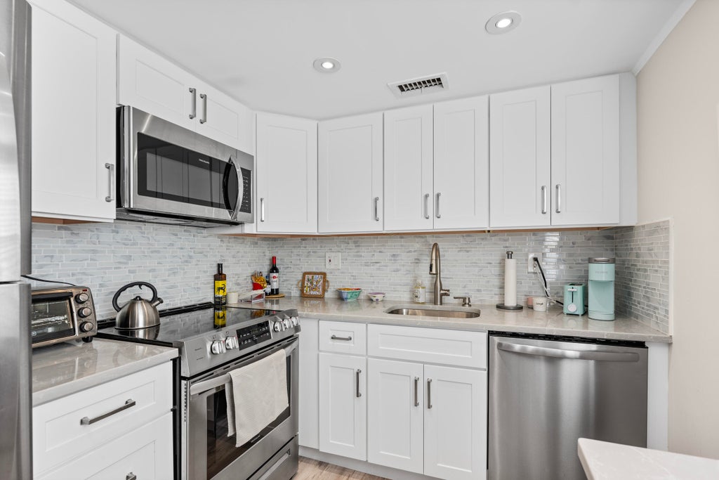 Come check out this beautifully updated ground-floor CBS 2-bed, 2-bath condo in the luxurious 55+ Kings Point Golf and Country Club Perfectly located steps from the Burgundy satellite pool and the Sims Road resident entrance. This impeccably maintained unit features a modern kitchen with white shaker cabinets, a stylish tiled backsplash, stainless steel appliances, and quartz countertops. The living area boasts waterproof laminate flooring, while the bedrooms and bathrooms feature tiled flooring. Both bathrooms have been tastefully updated with tiled showers, sleek vanities, and glass shower doors.Enjoy peace of mind with a new AC installed in 2020 and a water heater updated in 2022. Offered fully furnished, this condo is truly move-in ready--just bring your toothbrush!