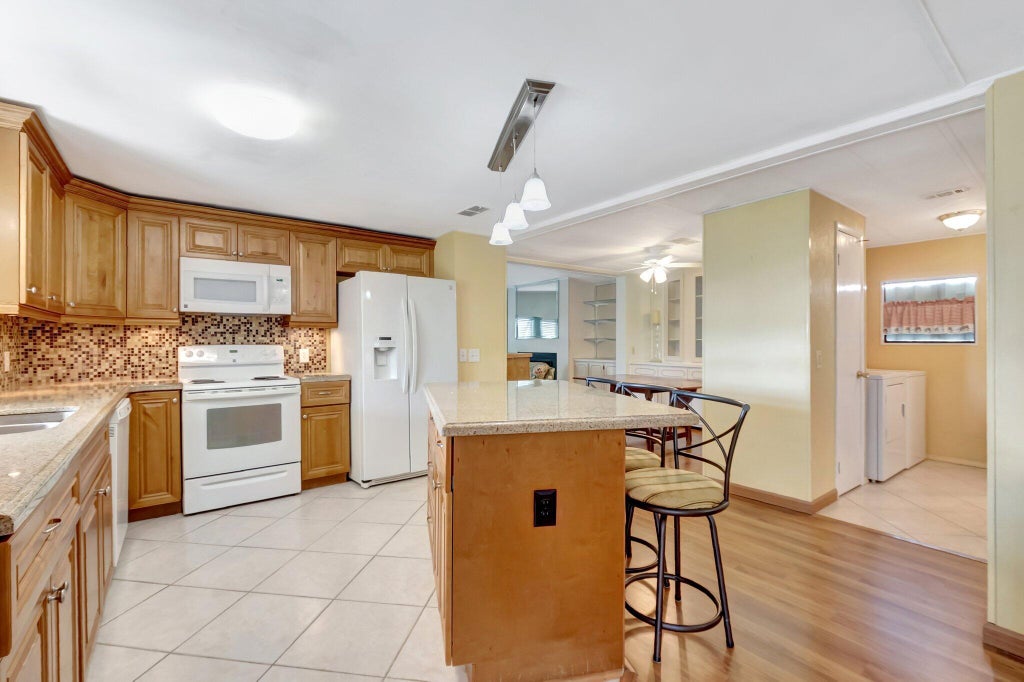 Plenty of space to spread out in this oversized home with almost 1400 sq ft., 2 living spaces, multiple walk-in closets, abundance of storage, and plenty of natural light! This open floor plan home has 2 bedrooms, 2 bathrooms, updated kitchen with custom cabinetry and granite counter tops, island with additional storage, laminate and tile flooring throughout, updated bathrooms, bahama shutters AND accordion shutters for storm protection, laundry room INSIDE, and a spacious raised florida room to relax and enjoy the gorgeous Florida weather. The LOW association dues include, internet, lawn care, water, sewer, trash removal, 24/7 manned gate, on-site property manager, an abundance of amenities providing heated pools, bocce ball, shuffleboard, clubhouse, library, dog park, putting gree