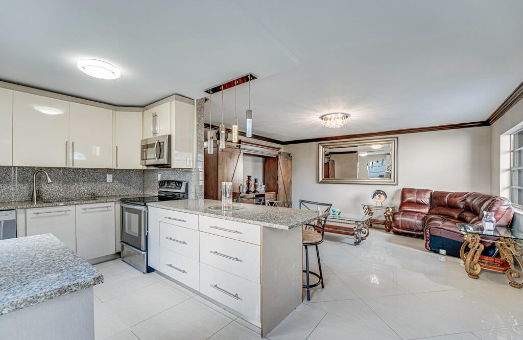 :No expense spared in this stunning, spacious 2-bedroom, 2-bathroom condo at 401 Burgundy I. Completely remodeled with porcelain floors, stainless steel appliances, and a designer kitchen featuring extra cabinets and self-closing drawers. Custom details include handmade doors, crown molding, and bathrooms with multi-pressure shower heads. Enjoy the enclosed patio with access from both bedrooms. Washer/dryer included, with water heater (2015) and A/C (2012). Conveniently located near the entrance and just steps from the satellite pool. Move-in ready!