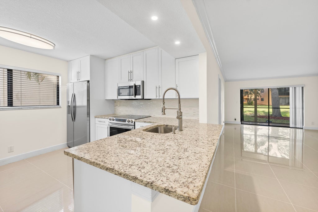 Welcome to this beautifully renovated condo in Pembridge E of Lakes of Delray, FL. HOA fees for 2025 have been decreased!! Step inside to discover elegant porcelain flooring that flows seamlessly throughout the home, complemented by tasteful crown molding that enhances its sophisticated charm. The neutral decor creates a serene and welcoming atmosphere, while the stunning lake view, visible from both the living room and the covered, screened patio, adds a tranquil touch of natural beauty.The thoughtfully designed layout features French doors opening to a versatile utility space, ideal for a home office or extra storage. The open-concept living and dining areas promote an inviting, social environment perfect for entertaining or quiet relaxation.