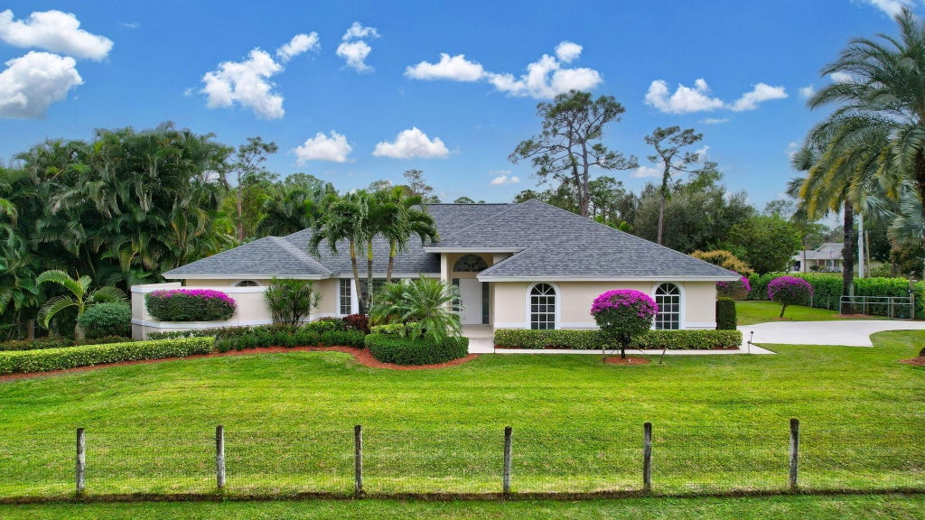 HOME IN JUPITER FARMS * 4-bedroom, 3-bathrooms 2 car garage 2600 sq. ft. with a 2024 NEW ROOF, tropical retreat on a professionally landscaped 1-acre + property paved roads. This home features a great floor plan, vaulted ceilings & abundant natural light, a spacious kitchen with new appliances, double oven, new flooring inside & exterior newly painted, primary suite with a spa-like bathroom. Three additional bedrooms (split floor plan) offers flexibility for family or work-from-home. Outside, enjoy lush gardens, a 25x12 ft patio & multiple versatile outbuildings, including a 35x35 detached workshop & three sheds for storage or hobbies /cars. This property combines comfort, functionality, & serenity, creating the perfect private oasis, fully fenced yard. A Rated Jupiter Schools