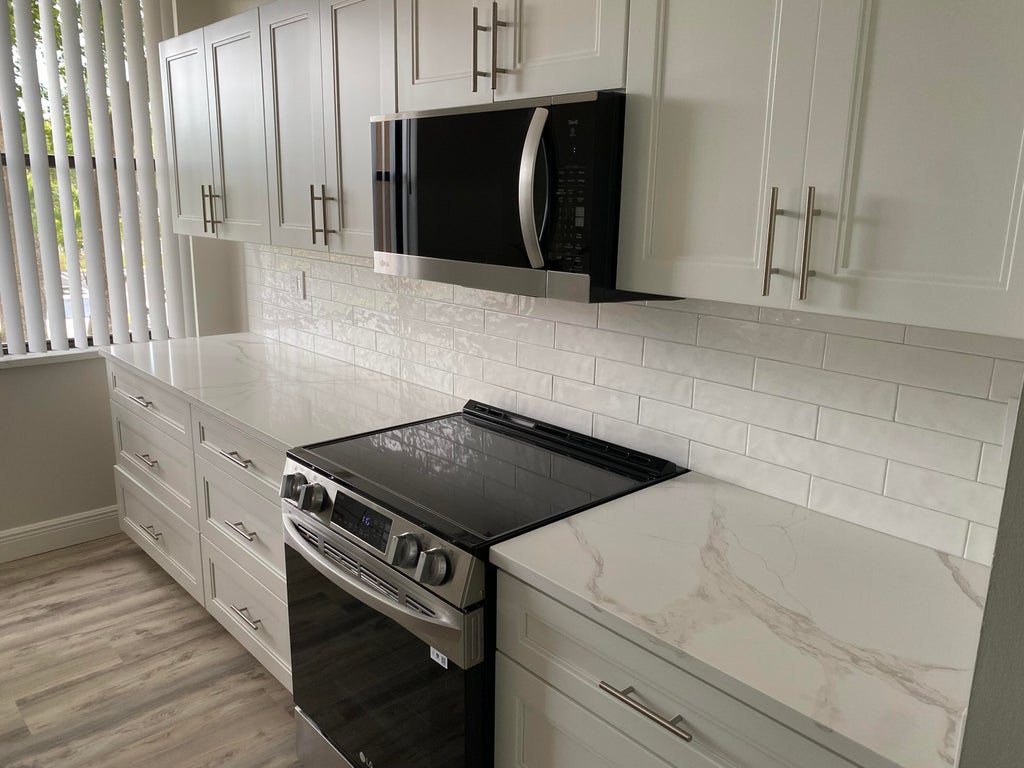 Fresh and Newly Remodeled in East Delray! 1/1 in Delray Racquet Club available April-Nov. monthly.Driftwood laminate flooring w/new ceilings and baseboards. New white shaker Jarlin cabinets with Carrara White Quartz Countertops in Kitchen with high end SS LG Appliances.New Samsung TVs. New walk-in shower and surround tiles and new window treatments! Full size washer/dryer with new a/c. Designer decorated..Rent includes Cable TV, WiFi,water and trash removal. 2 community pools w/spa facilities. 25 Tennis Courts, newly remodeled Fitness Center,jogging/walking trails with lakes. 2 blocks from Whole Foods,Starbucks,Target. 10 minutes to Atlantic Avenue and everything Downtown.Only 1 mile to the Beach. 13% tax for any lease under 6 months.
