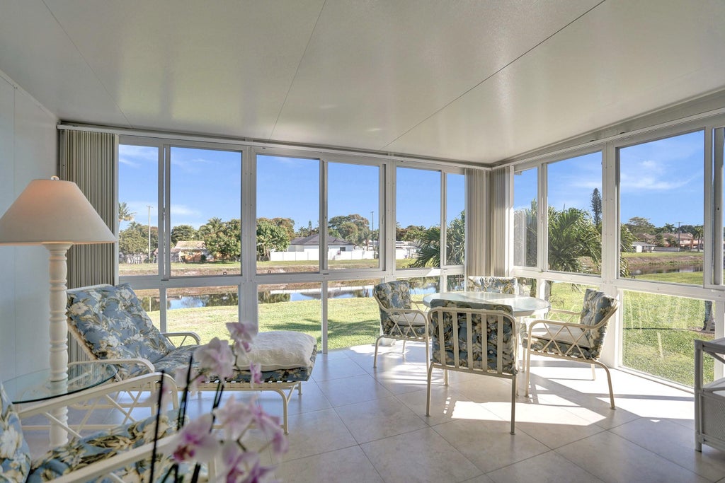 PINES OF DELRAY: Exceptional renovation in a contemporary design. Experience comfort and style in this 2nd floor southeast corner 2 bedroom/2 full bath luxury retreat; overlooking navigable canal; 1167 square feet under air plus a 170 square foot patio/lanai with 5 sets of slider windows; contemporary wall colors; 20 inch X 20 inch tile floors; 5 1/2 inch baseboards; rocker light switches; all 2022 PGT hurricane impact windows; 2021 Rheem 2-ton 14 seer AC system; 2024 Rheem 28 gallon water heater; modern 17 foot long eat-in kitchen with white shaker style 39 inch tall upper cabinetry; soft close hinges; 16 feet of quartz countertops; 4''x 2'' tile backsplash; under cabinet lighting and recessed lighting. Active adult (55+) community; co-occupants must be 18+. Up to 2 cats welcome!