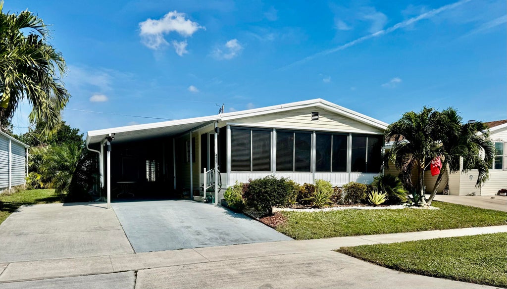 Wow, Wow, Wow! A Hidden Gem in the Quiet Streets of Tropical Breeze Park! YOU OWN THE DEEDED LOT with an incredibly low HOA fee of only $117/month - VOUS ETES PROPRIETAIRE DU TERRAIN, SEULEMENT $117/MOIS. This spacious and immaculate mobile home is sold furnished and turnkey, ready for a fast and easy move-in. Extensive renovation done throughout the house in 2019 as you can see it is gorgeous. With an extra-large carport and shed, this home offers the comfort and space you've been looking for. Enjoy the front Florida room, located at house level, featuring large screened windows and a cathedral ceiling--ideal for relaxing, entertaining friends, or watching TV.