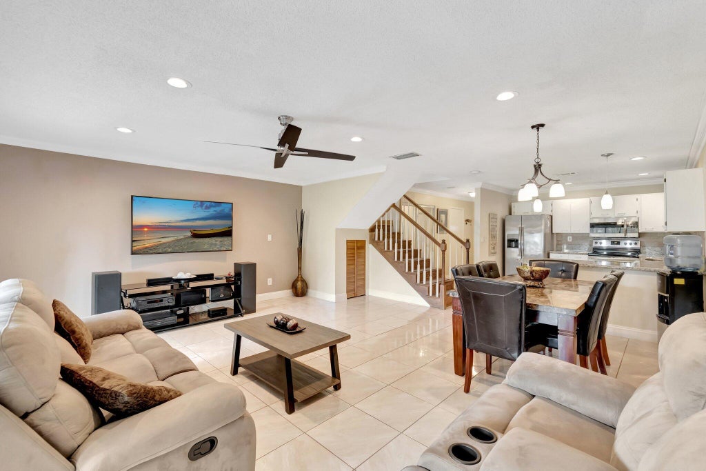 Move right in to this renovated townhome! The roof & AC are 2023 with transferable warranties! The water heater is 2021. A hurricane impact sky light was installed in 2024 & there are almost complete hurricane panels. The updated primary bathroom has a Bath Fitter walk-in shower with a lifetime warranty! The 1st floor is completely tiled & the 2nd floor & stairs have wood laminate. There are 4 lighted ceiling fans, complete window treatments, and crown molding! The main level open floor plan is ideal for entertaining! Dine alfresco on the covered & screened large patio! Yes--bring your grill! The large greenspace in the back makes walking your dog super easy! The HOA monthly is 1 of the lowest in all of Palm Beach County! Quiet family oriented neighborhood--minutes to the turnpike & I-95!