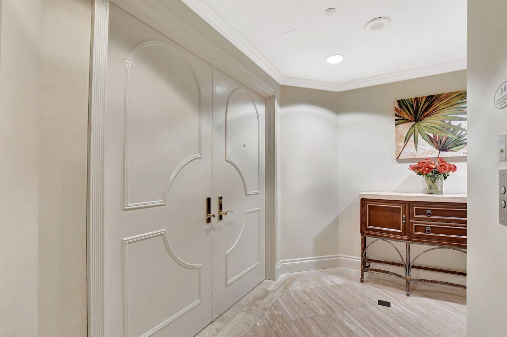 Beautifully updated Grand Siena model in the prestigious Toscana West. The unit features the finest appointments like marble floors in the living space, hardwood floors in the bedrooms, custom built in wall unit in the living room with a desk, custom French doors in the living room allowing you to create a 'flex' 3rd guest suite, crown molding, Phantom rollaway screens, built out closets, and designer lighting. The primary suite offers expansive intracoastal views and a sliding glass door leading to your 33 ft balcony. The ensuite guest bedroom has a walk in shower and ocean views to the East. The unit is being sold fully furnished and designed. Perfect opportunity to move right in and enjoy the winter months. Toscana offers the top resort style living in the entire area!
