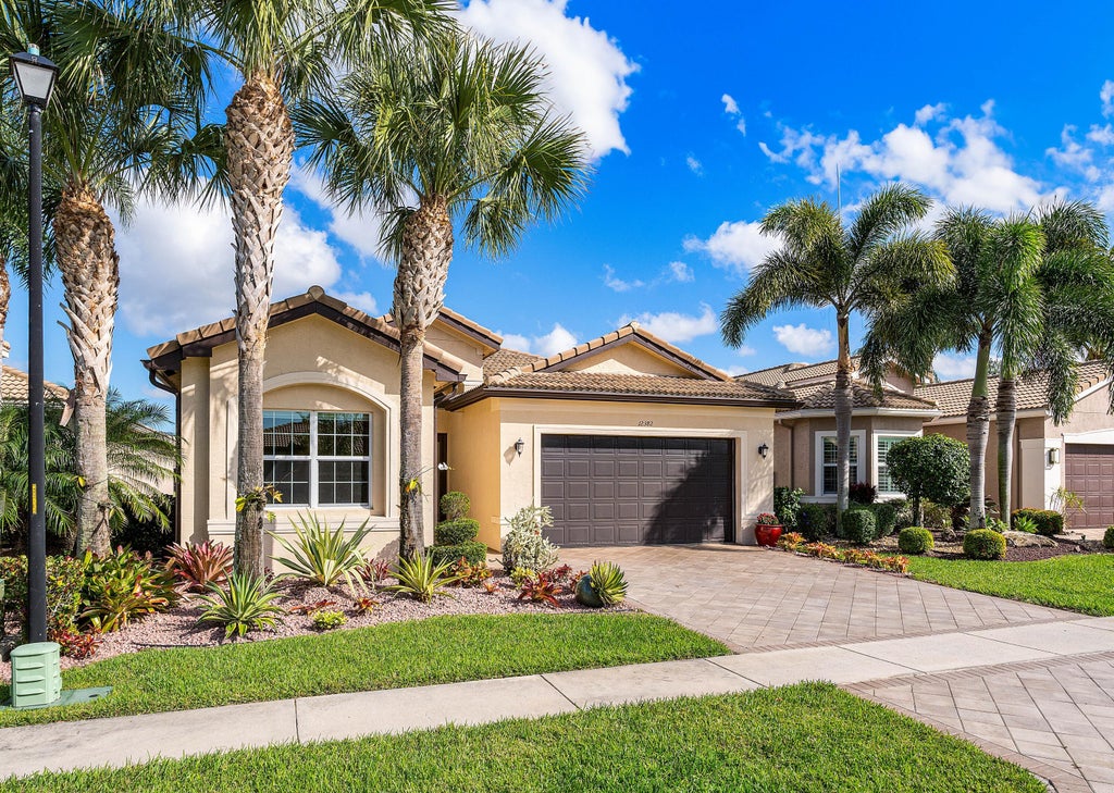 Wake up to breathtaking sunrises over the lake in this beautifully appointed Atlantica model home in Valencia Cove. Featuring elegant porcelain tile throughout, this home offers a spacious and open floor plan. The home is graced with designer fans, chandeliers, custom Hunter Douglas window treatments, and crown molding. The kitchen boasts rich wood cabinetry with upgraded pull-outs in both the pantry and lower cabinets for ultimate convenience. Enjoy abundant natural light thanks to the home's expansive windows and sliders along the rear. The primary suite is a true retreat, showcasing stunning lake views and custom closet cabinetry designed for optimal organization and storage. Additional highlights include impact glass windows throughout, New A/C (7/2024), New Water Heater (6/2024).