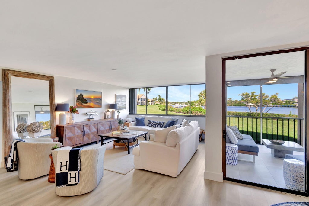 Experience breathtaking, wide, and scenic water views of the Loxahatchee River from this beautifully renovated first-floor condo in Turtle Creek East. This exceptional 3-bedroom, 3-bathroom residence boasts an open floor plan creating a spacious and airy feel while maximizing the stunning waterfront vistas spanning north, northwest, northeast, and east of the Loxahatchee River. The gourmet kitchen is a chef's paradise, thoughtfully designed with a bright eat-in area perfect for casual dining and entertaining. Meticulously maintained, this home features elegant wood-look flooring throughout. Enjoy the tranquil surroundings from your screened porch and outdoor patio, ideal for relaxing or entertaining.