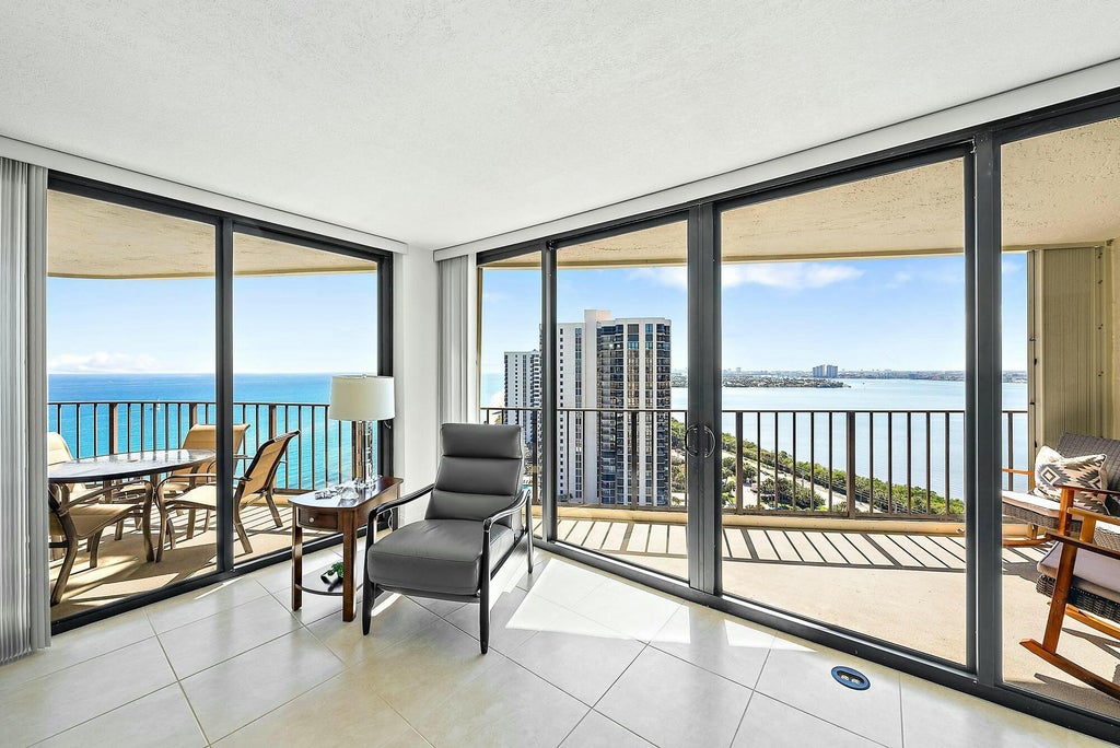 Amazing Sunrise and Sunsets! High expansive views of the beach, intracoastal waterway, Palm Beach Island and West Palm Beach. This 2 bd, 2 bath unit has a great open split plan with access from everyroom through floor to ceiling impact glass doors onto the 2 covered balconies. Master bedroom suite with walk in closet. A/C 2021, tankless water heater. Enjoy great amenities including beach access, pool, fitness room, extra storage, community room, on-site management, and one covered parking space. Can lease after 1st year of ownership.