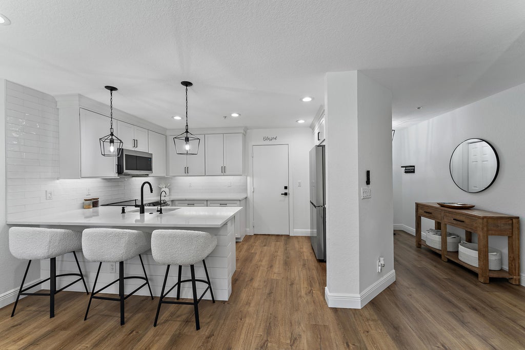 Discover this move-in-ready home, offering modern upgrades and thoughtful details throughout. The recently renovated kitchen features new custom cabinets with quartz countertops, new stainless steel appliances, and under-cabinet lighting, creating a sleek and functional space. The home also boasts updated baths, luxury vinyl flooring throughout, and fresh interior paint for a bright and contemporary feel. Enjoy the tranquility of preserve views right from your backyard, while the high hats provide elegant lighting throughout the home. Additional updates include a new hot water heater and a 4-year-old A/C unit. With low HOA fees and a prime central location near I-95, this home offers convenience and value. Seller is offering a roof credit--bring all offers!