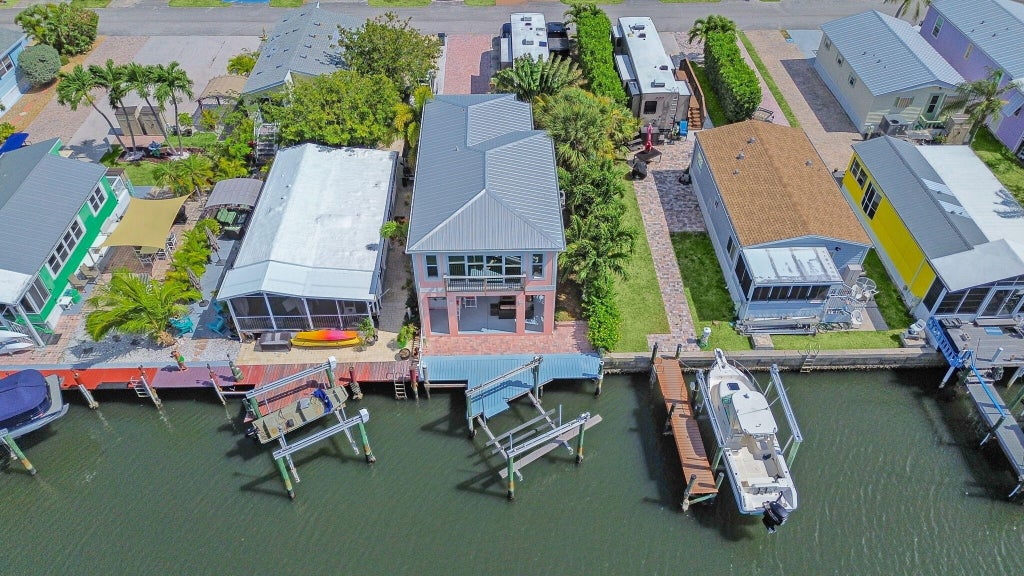 CUSTOM BUILT NEWER CBS KEY WEST STYLE HOME ON HUTCHINSON ISLAND! Built in 2022 with impact windows and metal roof. This property boasts 30ft. of waterfront just shy of the intracoastal with a 10,000lb Neptune boat lift capable of up to a 30 foot boat. Fish from your dock. Huge lanai with a bar, refrigerator, sink, and even an outdoor bamboo shower. Well appointed kitchen with quartz countertops, convection oven and microwave and an Induction cooktop. Luxurious bathrooms featuring a rain shower in both and a double sink vanity in primary. This community offers a waterfront paradise with boating, community pool, beach access, and boat launch. Come experience the Florida lifestyle on Hutchinson Island featuring beautiful sunsets from the lanai, sunny beaches, nature preserves, golf, museums