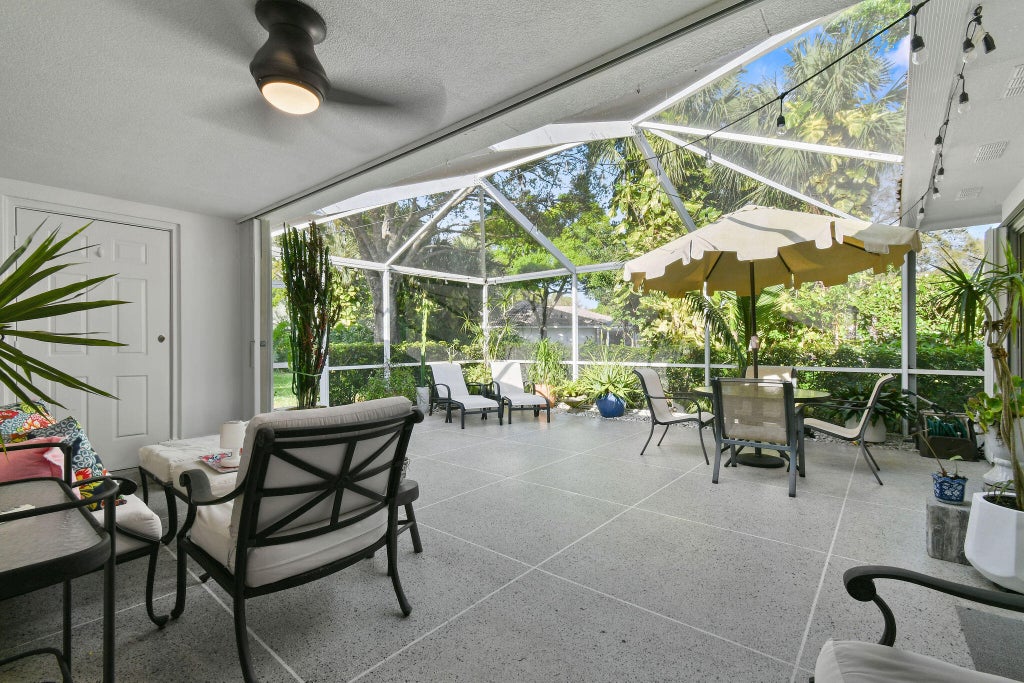 This beautiful Oaks Sun Terrace patio villa has a split floorplan with two private suites, vaulted ceilings and new porcelain tile throughout. Open concept kitchen with recessed lighting, stainless appliances and decorative tile backsplash. A/C unit (2020) equipped with antiviral system. ADT alarm system, large private screened patio with decorative resurfaced concrete and storage room not facing the parking lot. Concrete construction with accordion hurricane shutters. Quiet neighborhood with community pool and spa. Located in Palm Beach Gardens with easy access to I-95, the Florida Turnpike, very close proximity to restaurants and shopping. The beach is less than 3 miles away.
