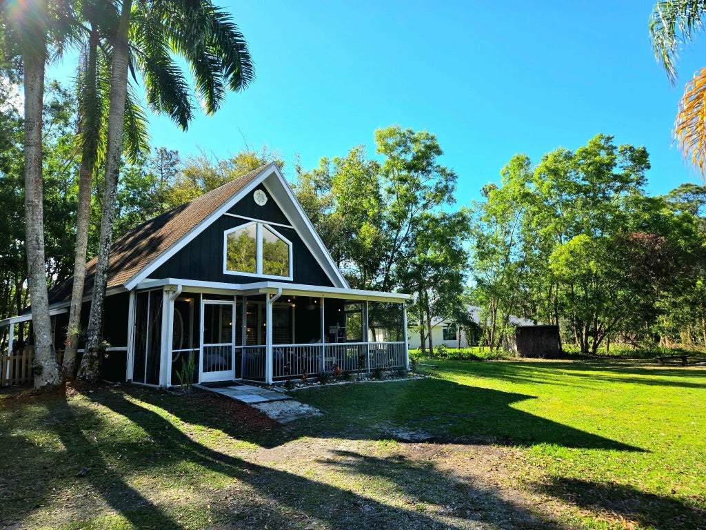 CHARMING 3 bedroom, 2 full bath private oasis on an acre plus a quarter of land. Entertain in the open concept kitchen to living room complete with a separate coffee bar and beverage refrigerator as well as a custom TV wall with ambiance of an electric fireplace. Newer appliances, complete air conditioning system replacement and a new well. Exterior has also been painted. Enjoy your morning coffee on the screened in porch as the peaceful and quiet nature surrounds you. The porch overlooks the mango tree and pond on this retreat that is fully fenced and gated. There is plenty of room to safely store your RV and/or boat. Included is a sub panel electric panel with two 50 amp connections. There is also a detached 12x24 bonus room/man cave on the property as well as a garden shed.