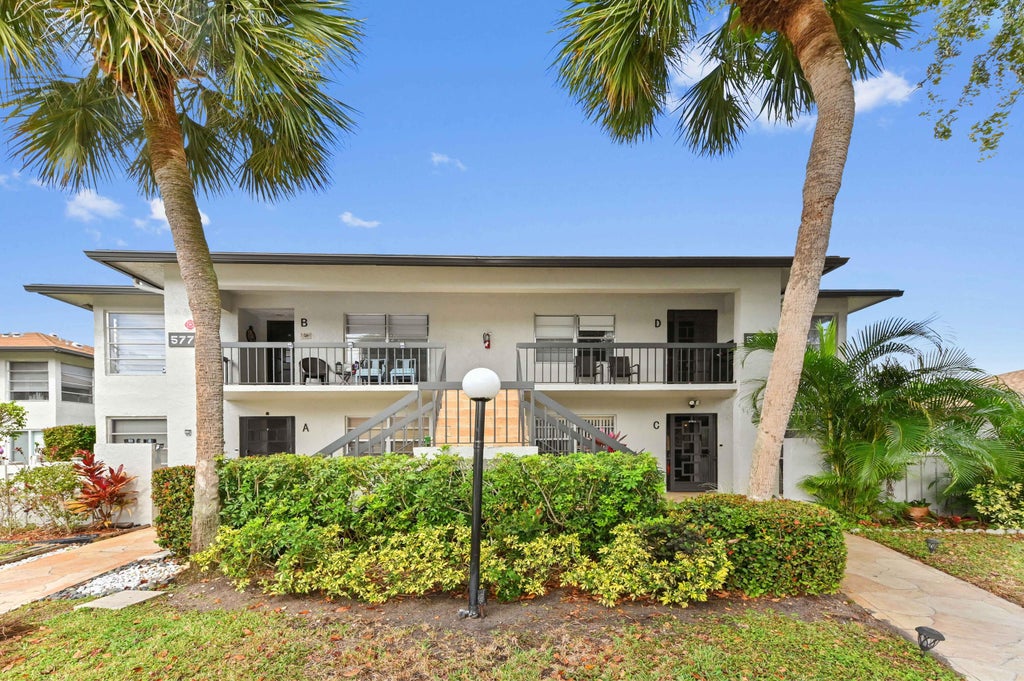 With the warming embrace of Delray Beach, FL, 5779 Spindle Palm Court reveals itself as a true embodiment of charm and ample space, standing proudly within the sought-after Palm Greens active adult community. This lakefront condo flaunts a floor plan defined by openness and intelligent design, encouraging the flow of light and life within its walls. A flooring of ceramic tile escorts residents through the expansive living area, robust in its endurance, yet graciously welcoming. The heart of this home lies in its kitchen, which is an invitation to connoisseur cooking and hearty family meals. Embracing an ambiance that is simultaneously cozy and spacious, the kitchen further incorporates a vast pass-through and generous cabinet storage, alongside the convenience of a stackable washer/dryer
