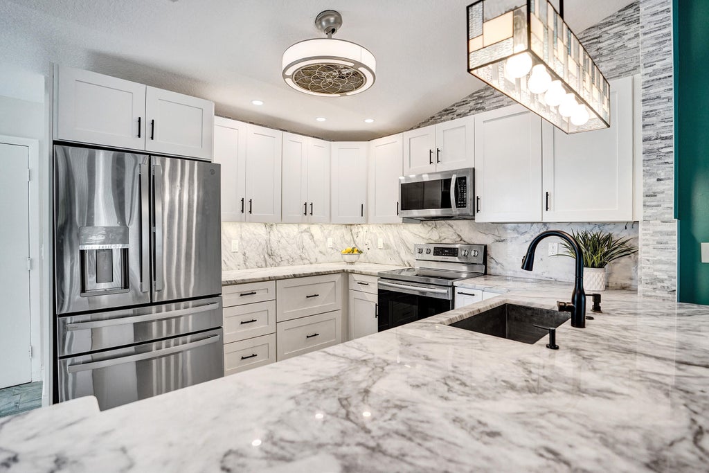 Welcome to The Hampton where modern luxury meets timeless sophistication. This priced to sell impeccably remodeled, all-ages, pet friendly, 3-bedroom, 2-bath villa is designed for the most discerning homeowner. Step into an open-concept layout with vaulted ceilings and an enclosed lanai that seamlessly blends indoor elegance with outdoor serenity. The gourmet chef's kitchen is a masterpiece, featuring exquisite quartzite countertops and bespoke high-end finishes that inspire culinary creativity. The primary suite is a private retreat, boasting a spa-inspired bathroom with a jacuzzi tub, a separate rainfall shower, and a skylight with electronic shades. Elegant porcelain tile flooring flows throughout, complemented by modern ceiling fans, motorized blinds in the living area, and walk-i