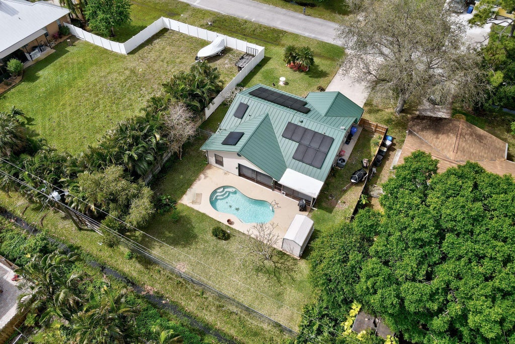POOL HOME Immaculate,well maintained cozy cottage w/sparkling pool, fenced yard. 2019 Metal roof, split bedrooms, built in office space, large screened lanai leads to pool paradise w beautiful landscaping. You own the solar panels, installed with clamps- no holes! Current electric bill is $25 per month! Generator hook up. Owner suite w wood floors, french doors to lania w pool access. Hardiboard siding, extended driveway, well for irrigation, county water. Dine in Kitchen recently updated, plenty of wood cabinets, beautiful counters, appliances, lighting. Economical features equal low cost living- chickens allowed! Window storm protection with wood panels. AC ,wtr heater 2016. Convenient to desirable Vero Beach, pristine beaches, historic downtown Fort Pierce for fishing .