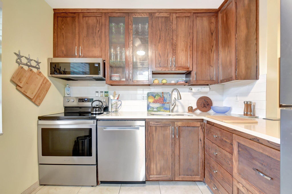 Impeccably Maintained, Wonderfully updated Light and Bright Corner Condo in Village Oriole Abbey! Custom Kitchen with Newer Stainless Steel Appliances! Both Bathrooms Completely renovated for a unified look and feel! Crown molding in the living space! No Carpet! Partial Hurricane windows, Including the Back Sliding glass door! Newer A/C and Water Heater! Lots of Storage including a Walk-in Closet and Storage Unit! Being Offered Furnished for a TurnKey Buying experience. Ceiling Fans in every room , New Blinds on all windows! Close to the Clubhouse offering a Fitness Center, Walking paths, Community rooms, and 2 Large Pools! Right off Atlantic, Close to Shops, Turnpike and I95! 700 Credit Required by Association. Condo accepts Financing. Service Animals Allowed. Children age 15+ allowed.