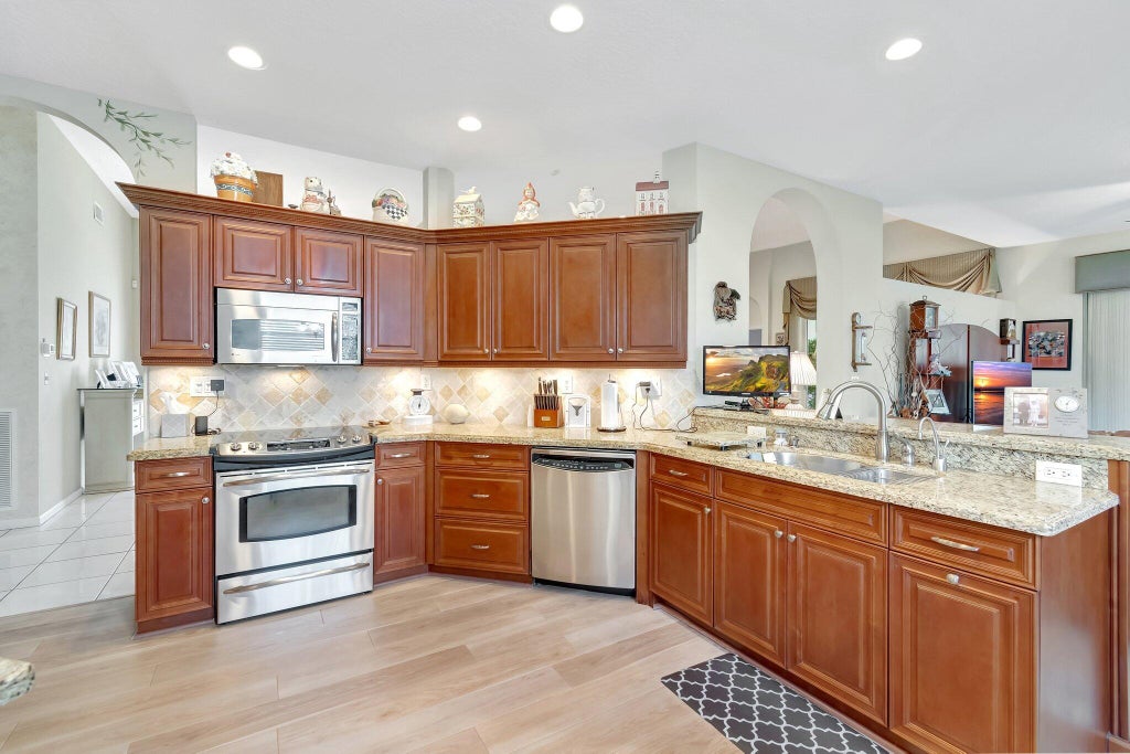 Positioned in the desirable Majestic Isles community in Boynton Beach, Florida, 5845 Seashell Terrace offers a seamless blend of comfortable living and sophistication. A prominent feature of this Crystal Manor model home, recognized for its functionality and elegance, is a spacious two-car garage.Moving inside, the interior eloquently boasts vinyl and tile flooring, offering a sleek and easy-to-maintain surface throughout. Exceptionally suited for hosting, accommodating dining spaces include a formal dining area and a more casual eat-in kitchen. Its culinary space is outfitted with a generously-sized, two-step walk-in pantry and granite countertops, complete with a full backsplash for an added touch of elegance.