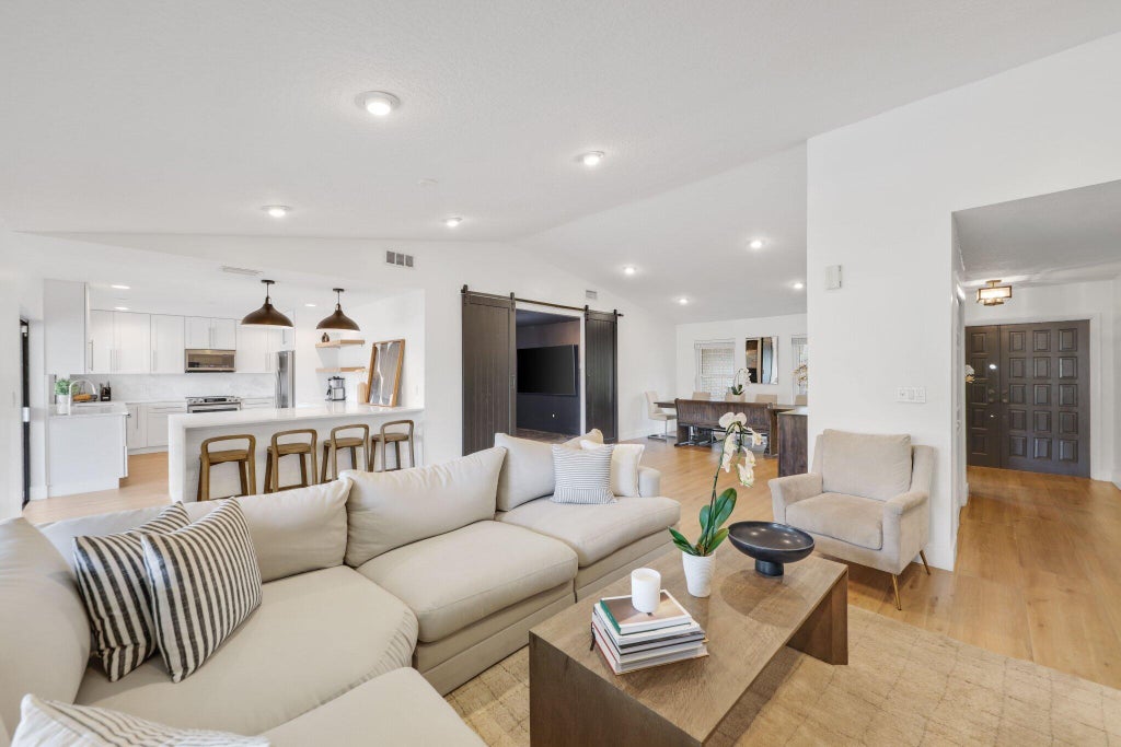 Welcome to this stunning, fully renovated home in Paseos, one of Boca Raton's most sought-after communities--where homes rarely become available. As you step inside, you'll immediately notice the open-concept design, enhanced by beautiful oversized white oak plank tile throughout. The kitchen is a true centerpiece, featuring a stunning translucent quartzite oversized peninsula with seating for 6-8. White oak floating shelves, custom soft-close pull-out drawers, and ample cabinetry. A dedicated movie room offers the perfect space to unwind for a cozy night in or entertain guests. This versatile room can also be converted into a bedroom, office, or playroom to fit your needs and lifestyle. Additional features include a brand-new washer and dryer, some impact windows, shutters throughout, a