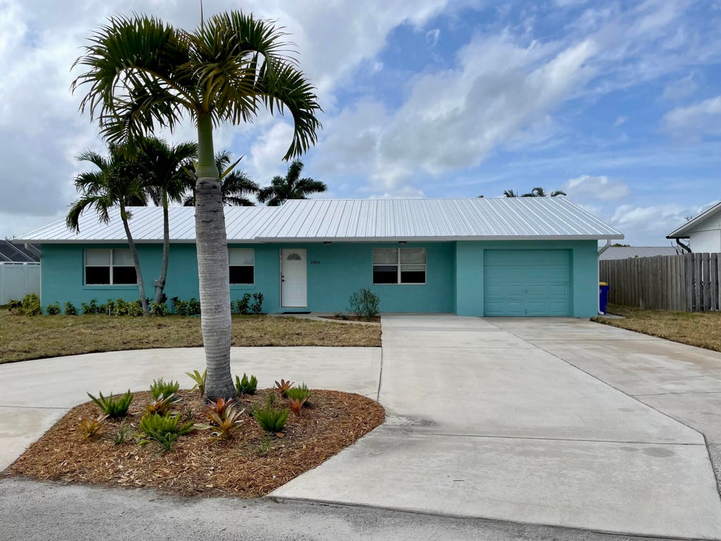 Perfect location in highly sought after Leilani Heights. This home is totally remodeled. From top to bottom. Inside and out. Open floorplan. Tile throughout. 3 bedrooms, with a flex room which could be used as office, den, or bedroom. All new soft closing cabinets and drawers. Gorgeous backsplash, island with drawers and brand-new appliances. Hall bath and master ensuite are brand new. Metal roof installed in 2024. New A/C in 2025. New hot water heater, doors and baseboards. Crown molding in main living area. Back yard which contains a 100-foot shed is fenced in for privacy. The sod was recently replaced in both front and back yards. Circle driveway plus additional 4 car driveway as well. Desirable Jensen Beach schools. Short drive to the beaches, parks, shopping and dining.