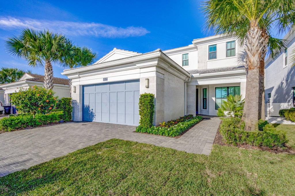 Welcome to Paradise in PBG gated community of Artistry. This exceptional home offers the perfect blend of luxury, captivating views, brightness & Florida Sunshine.From the moment you arrive, you'll be greeted by serene lakefront vistas from the front yard, filling your mornings with tranquil beauty. The synthetic grass backyard ensures hassle-free outdoor living, while the covered patio provides a welcoming space for year-round relaxation & entertaining. The centerpiece of the backyard is the sparkling saltwater pool & spa, creating a private oasis for entertaining. Inside, the home is a true masterpiece of modern design. The chef's kitchen is a culinary dream, eat in kitchen and top of the line appliances. Close to dining, shopping & 15 minutes to the beach.