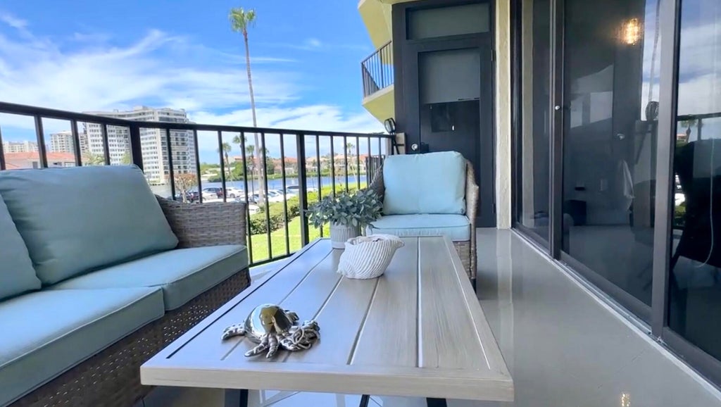Spacious 1 bed/1.5 bath waterfront condo in Porta Bella East! This 2nd-floor unit features 24'' rectified porcelain marble floors, fresh paint, 6'' baseboards, and new vinyl plank flooring in the bedroom. Remodeled bathrooms and artisan light-filtering shades throughout. The kitchen offers white cabinetry and granite countertops. HVAC (2019) with a new thermostat. The primary bath has a separate vanity and tub/shower combo. A large open patio spans the living/dining area, overlooking the canal and Intracoastal. Covered parking and rentable dock space. Community amenities include tennis, pickleball, gym, heated pool, and a manned gate. HOA requires a 700+ credit score. Assessment paid in full. Minutes to the beach!