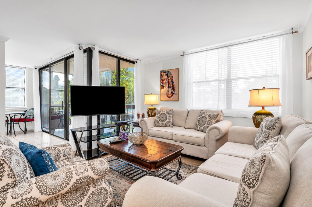Beautifully decorated 2 bed and 2 bath corner condo in the great community of the Delray Racquet Club. Ideally located about 1 mile to Delray's finest beaches, I-95, shoppes, restaurants, and renowned Atlantic Blvd. Walking distance to Trader Joes, Wholefood, etc.. Light and bright open floor plan, split bedroom, washer and dryer in the unit. Beautiful porch facing the tennis courts. New Air conditioning. ALL NEW VINYL FLOORS. Community pool, jacuzzi and fitness center on the back of the building.