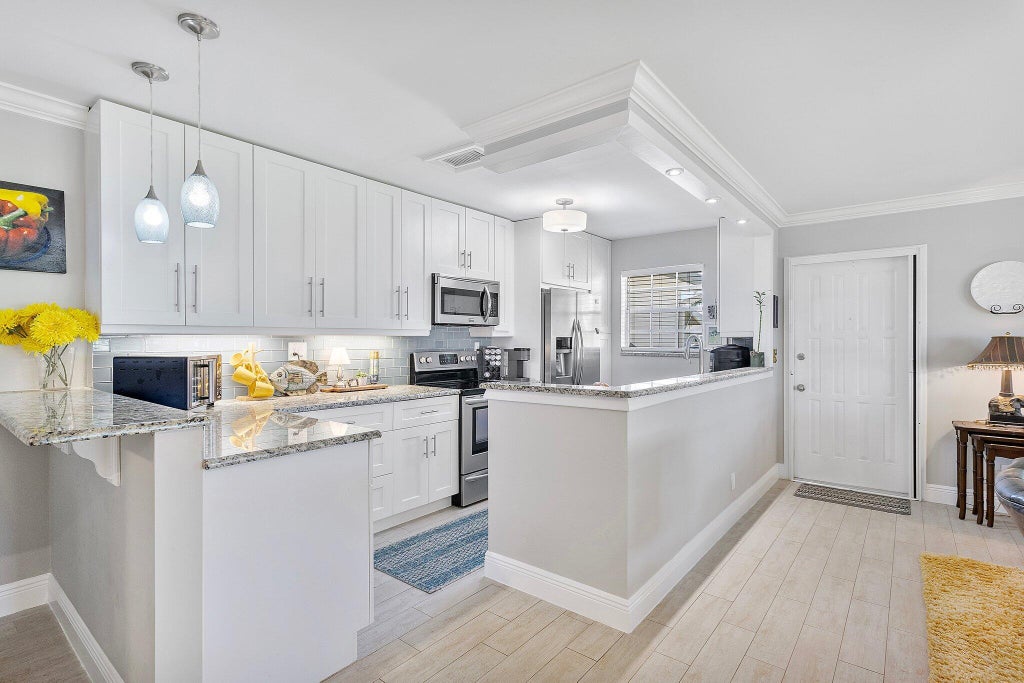 Beautifully remodeled with a decorator's eye & quality finishes, this lovely end unit villa feels like HOME. For the chef, an enlarged kitchen w/upgraded cabinets, stainless appliances, granite, 2 peninsulas - endless counter space! Coffee & conversation at the breakfast bar. Open living area + a Florida room perfect for a cozy den, office, or formal dining room. Stylish, contemporary bathrooms. Private patio, wood plank tile throughout & popcorn free! WELL-MANAGED WITH ABUNDANT RESERVES, High Point Sec 5 suits a carefree active, adult lifestyle. Community maintenance & upgrades done & assessments paid. 2024 remodeled clubhouse, pool area, tennis, pickleball, & shuffleboard. Low maint fee includes bldg ins & maint water, cable, INTERNET, pest. A/C 2023/H2O 2017/ROOF 2016/ELEC PANEL 2023