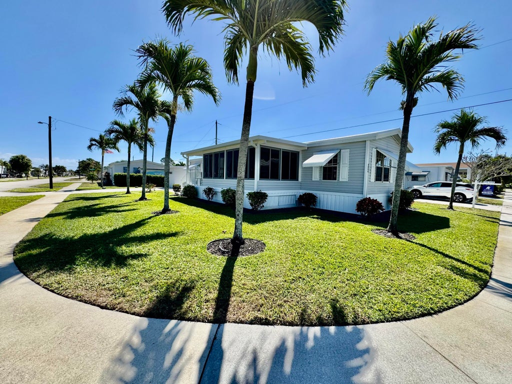 Nestled within the vibrant 55+ Tropical Breeze Estates community, this meticulously maintained 2005 manufactured home offers a harmonious blend of modern living and comfort. The residence features a spacious open floor plan, encompassing a bright kitchen, dining area, and living room, all illuminated by impact windows Skylight that invite abundant natural light throughout the open common area. A recently added Florida room extends the living space, providing a serene spot to relax and entertain. The home comes fully furnished and turnkey displaying a contemporary decor, ensuring a seamless move-in experience.Beyond the home's inviting interior, Tropical Breeze Estates enriches residents' lifestyles with an array of amenities.