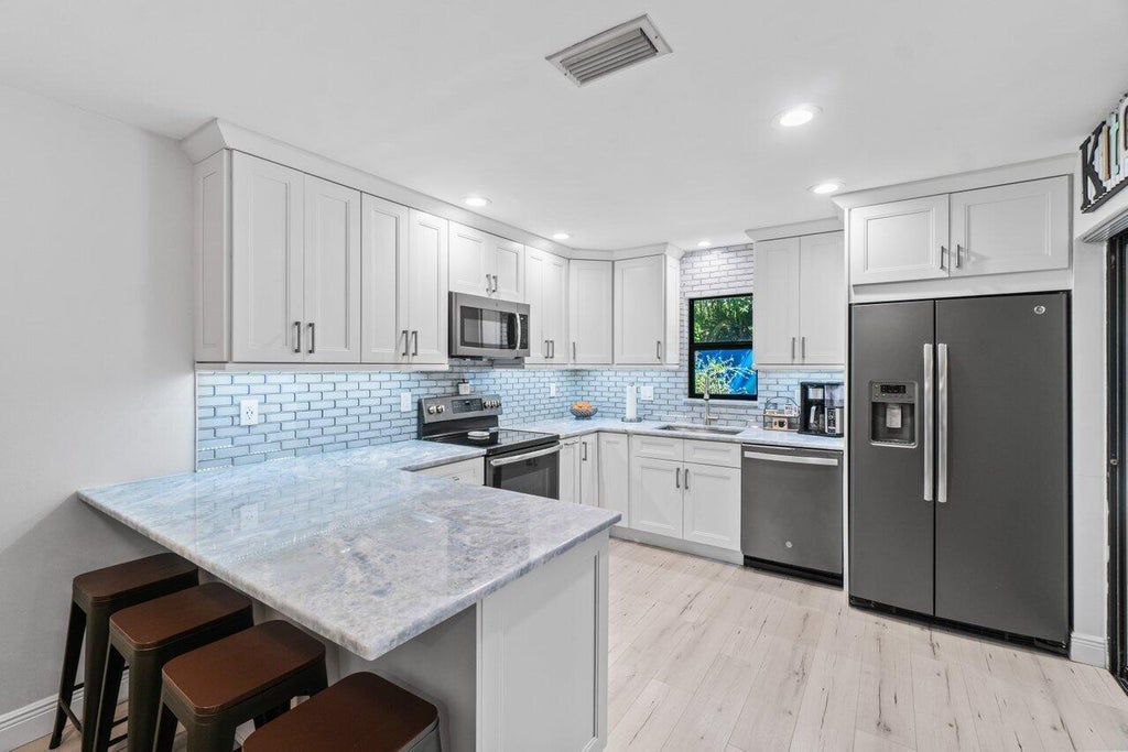 Welcome to this stunning 3 bedroom, 2.5 bathroom townhome in the desirable Chateau on the Knoll community, perfectly situated in the heart of Boca Raton. With a new roof (2023) and new A/C (2022), this move-in-ready home offers both modern style and lasting peace of mind.Step inside to find gorgeous wood-look laminate flooring that flows seamlessly throughout the open-concept main living area. The chef's kitchen, remodeled in 2020, is a standout, featuring solid wood shaker cabinetry, Cristalina blue quartzite countertops, a striking grey glass tile backsplash, under-cabinet lighting, bar seating, and a dedicated pantry. GE appliances, upgraded recessed lighting, and an additional set of sliding glass doors leading to the private porch complete this stylish and functional space.