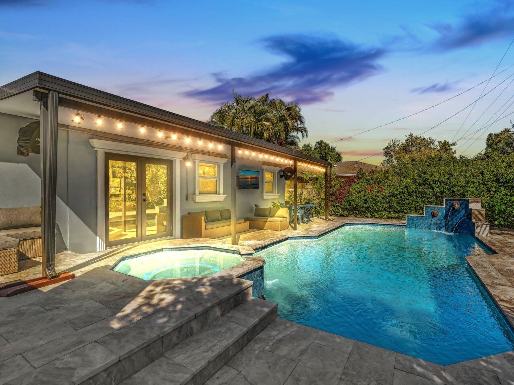 Imagine a home that feels like a sanctuary, embracing the beauty of nature and the calm of serenity. The architecture flows effortlessly with its natural surroundings, featuring large windows and doors that invite the outdoors in, flooding each space with natural light..This home is tastefully renovated with an open floor plan, 3 bedrooms, den, multipurpose room & chef's kitchen. The kitchen is equipped w/wood cabinets, granite counters & SS appliances. Master Suite with ensuite bath. The secluded backyard features a pool with a heated spa and a soothing waterfall amidst a nature preserve. Relax in the outdoor living area. Other features include Metal roof, ceramic tile, 2 car garage & circular driveway. No HOA! Close to beaches, golf, restaurants & downtown Delray Beach