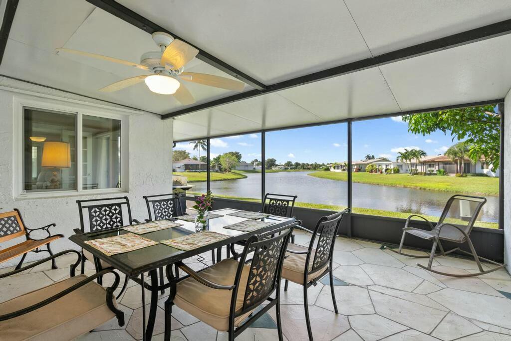 Long Lake views from this 2 bed, 2 bath, 1 car garage villa, it has an enclosed Den w french doors which can be used as a 3rd bedroom or office area. IMPACT WINDOWs and Sliders, 2022 Roof, 2015 AC & HWH, GE Elec Panel. All tiled throughout, front load washer/dryer + laundry sink. Sliders lead to tiled and enclosed large patio, enjoy outdoor covered dining. No popcorn ceilings! Stainless Steel appliances, granite kitchen, updated baths. Centrally located in desirable Delray Villas which offers clubhouse, pool, pickelball, bocce ball, tennis, shuffloeboard. Pet is ok - 1 dog or cat, up to 20 lbs, per association. Association fee includes lawn care, cable, internet(Breezeline), and pest control inside the unit.