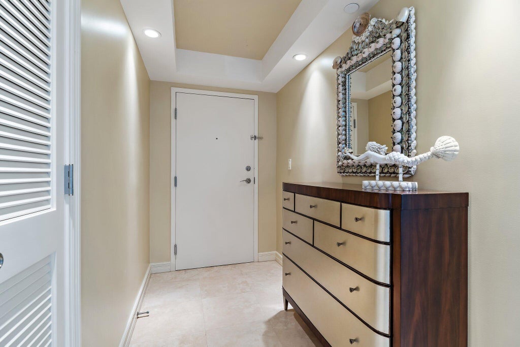 Beautiful Southeastern direct-oceanfront exposure, with beach and intracoastal views, abounding from every angle of this stunning, designer-finished 2-bedroom, split-floor plan, coveted ''C'' unit at Tiara! Beyond the foyer, a perfectly appointed kitchen with neutral granite counters, rich wood cabinetry, stone tile backsplash, wine cooler, stainless-steel appliances, and bar seating leads to the dining and living room areas with intracoastal to ocean views, all finished in natural travertine stone. Retreat to the Primary suite leading to the oceanfront balcony, tranquil, en-suite bath featuring raised sink, frameless glass shower, decorative tile backsplash, and spacious walk-in closet with custom built-ins. Private guest bedroom benefits from an attached bath with granite vanity, raised