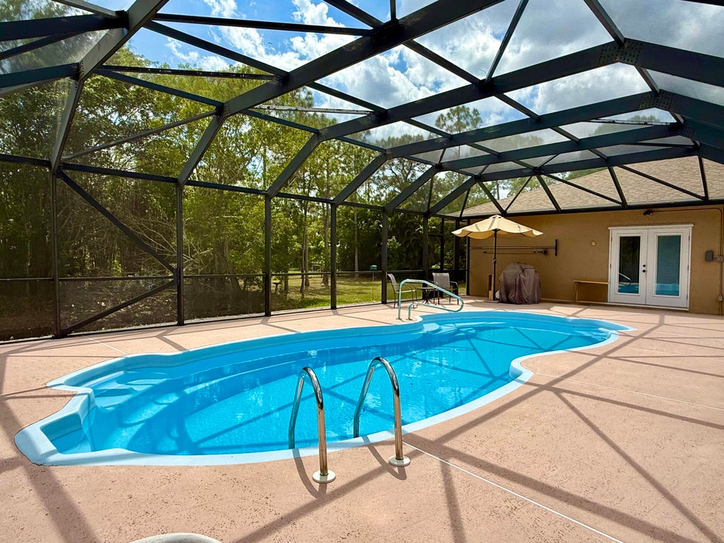 CBS 3 bedroom 2 1/2 bathroom 2 car garage POOL home on over an acre AND on a paved road in Jupiter Farms. Volume ceilings, beautiful open kitchen with quality real wood cabinets, granite counters, newer appliances, completely updated master bathroom, brand new whole house water treatment system, 24'x12' shed, large screened pool patio. MOTIVATED SELLERS!