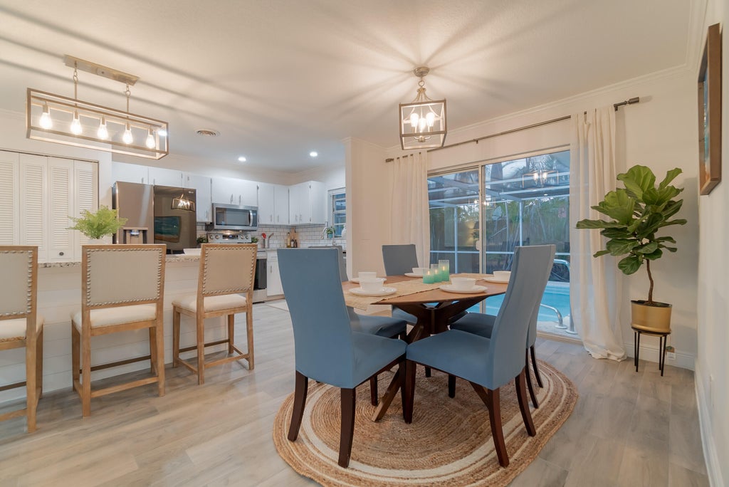 This charming 3-bed, 2-bath home in the family-friendly Leilani Heights community offers an open floor plan with modern coastal decor, the same wood looking tile floors throughout, and a spacious kitchen with new countertops and a large island. The primary suite features fully remodeled tiled bath, with the two additional bedrooms and the main bathroom on the opposite side of the house. Enjoy the screened-in pool and patio, perfect for outdoor living, plus a large front and side yard. Also has a 2-car garage with push button open/close. Being a half mile walk to Jensen beach elementary/post office, 2 miles to downtown Jensen Beach and 3 miles to the Jensen Beaches, this home is ideally located. Don't miss out on this beautiful, fully furnished, turn key property!