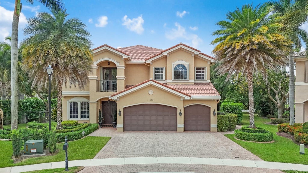 Located on a quiet cul-de-sac in the sought-after Canyon Lakes community, this spacious Sterling model offers 5 bedrooms and 4 full baths. The home features a formal living room, dining room, and a comfortable family room--ideal for both entertaining and everyday living. Enjoy neutral flooring throughout, accordion shutters for storm protection, custom closets, an intercom system, zoned A/C upstairs, and a closed circuit camera system covering the perimeter and main openings for added security and peace of mind. The elegant primary suite is a true retreat, featuring a tray ceiling, private sitting area with built-in cabinetry and a convenient kitchenette, French doors to a private balcony, his and hers walk-in closets, dual sinks, a soaking tub, and a walk-in shower.